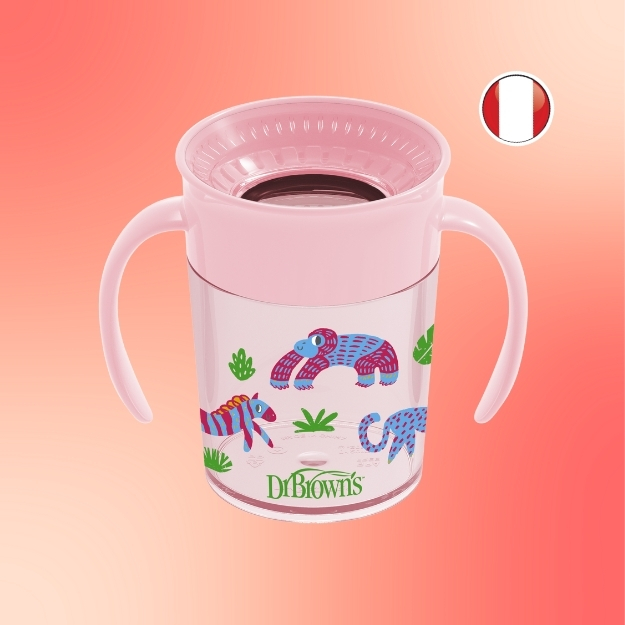 - Enseña habilidades de tomar como niño grande. ¡Brindemos por las transiciones a tazas de niños grandes! La taza de Dr. Brown’s Cheers360 de transición sin boquilla con asas ayuda a hacer los hitos un éxito.