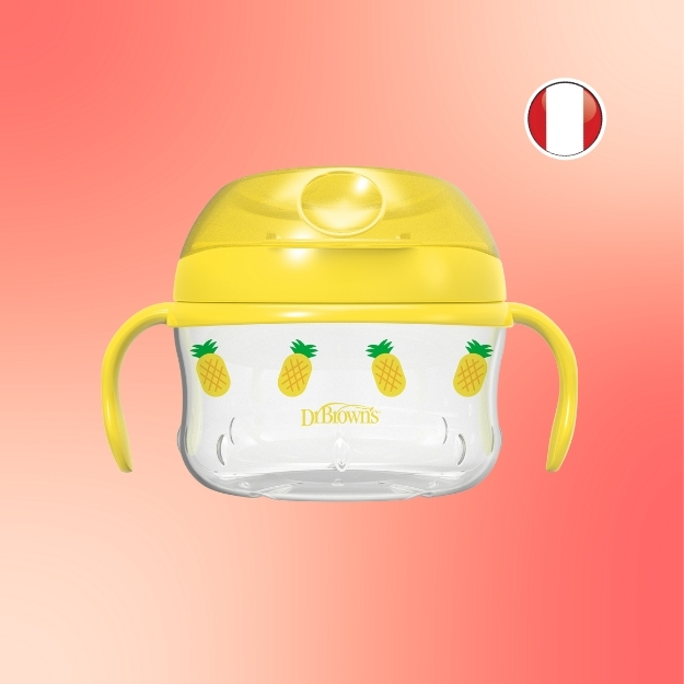 Tazón de Snack Dr. Brown’s color amarillo-piña. Tazón para Refrigerio, posee solapas flexibles y resistentes suaves para las manos de los niños pequeños, pero mantienen la comida en la taza cuando su niño está en movimiento. Las asas extraíbles, se adaptan a las manitas pequeñas de tu bebé, mientras que la parte superior giratoria se mantiene segura incluso cuando se cae. La tapa ayuda a minimizar los derrames y mantiene los alimentos frescos durante más tiempo. Hendidura del tamaño de un dedo en la tapa extraíble para facilitar la apertura. Se monta y desmonta rápidamente. Recoomendado para bebés de 9 meses a más. Libre de BPA.